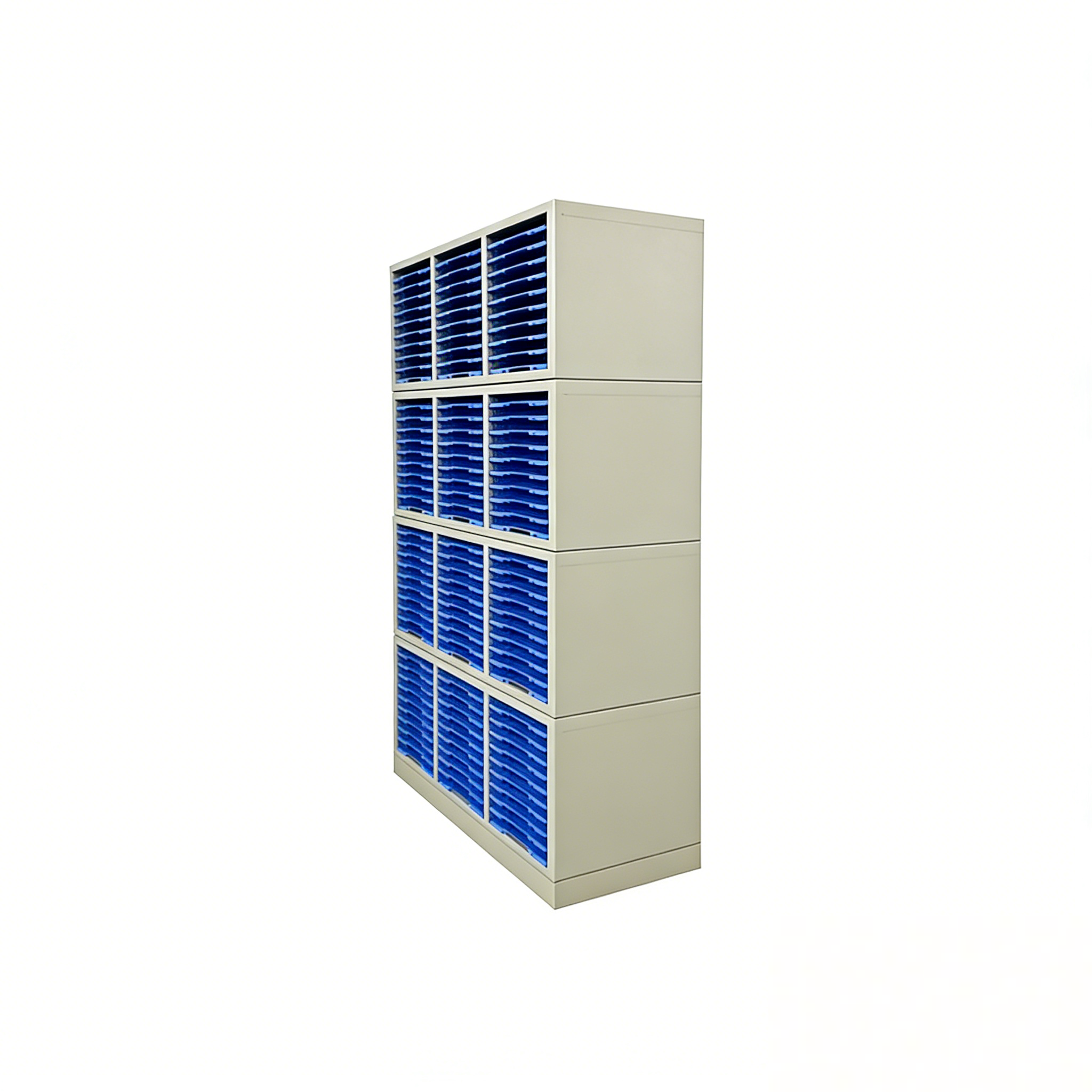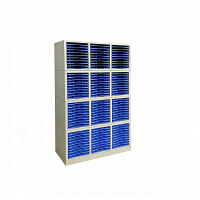 整体选材为1.2mm冷轧钢板,表面静电粉末喷塑。每单组分4节,采用PP注塑成型标准晾片板(世泰),每节20块晾片板,共80块晾片板。抽屉内隔板滑道为固定式,能使晾片存放整齐并使抽屉平整不走形。