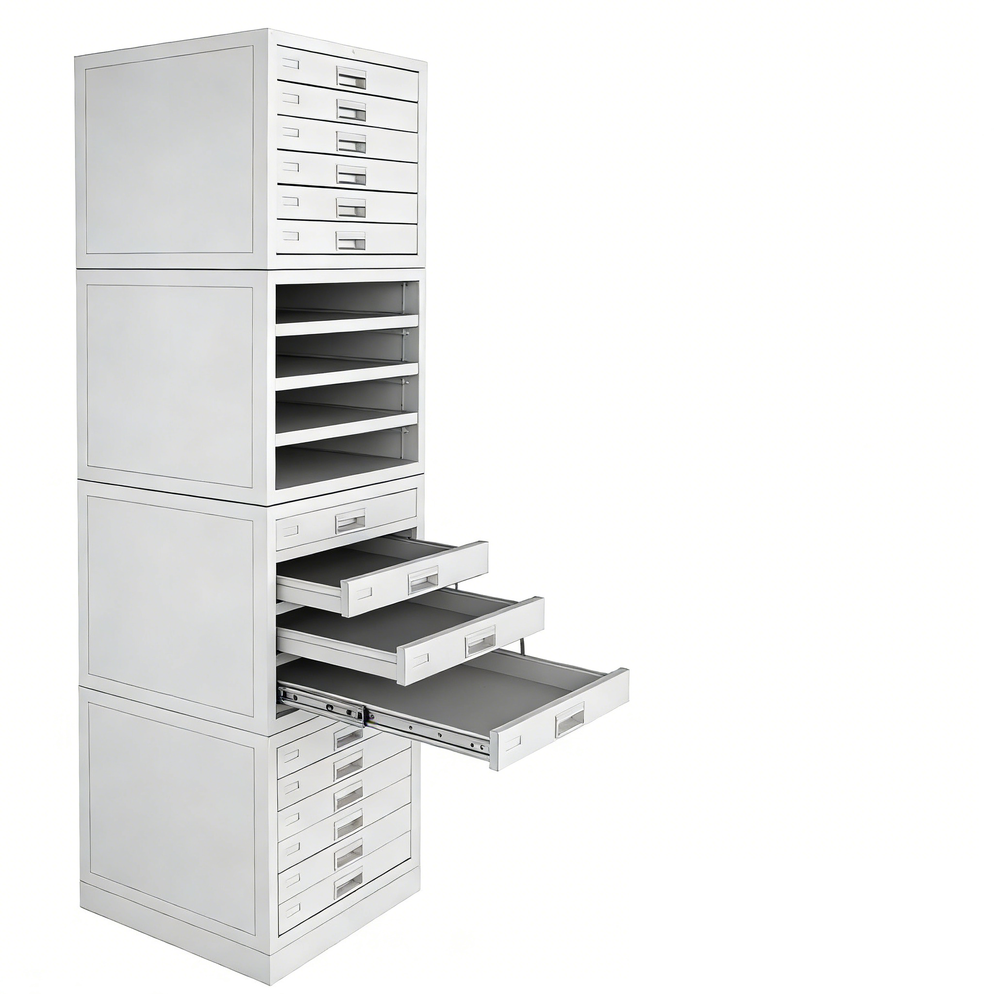本产品为4个箱体,每个箱体有6个储存抽屉,共24个抽屉,总高为1625mm。可放标准蜡块12000块。抽屉采用三节静音滑轨,前面有目录卡。抽屉内隔板为固定式,能使蜡块存放整齐并使抽屉平整不走形。专用插槽、标签槽一体化冲压成型。